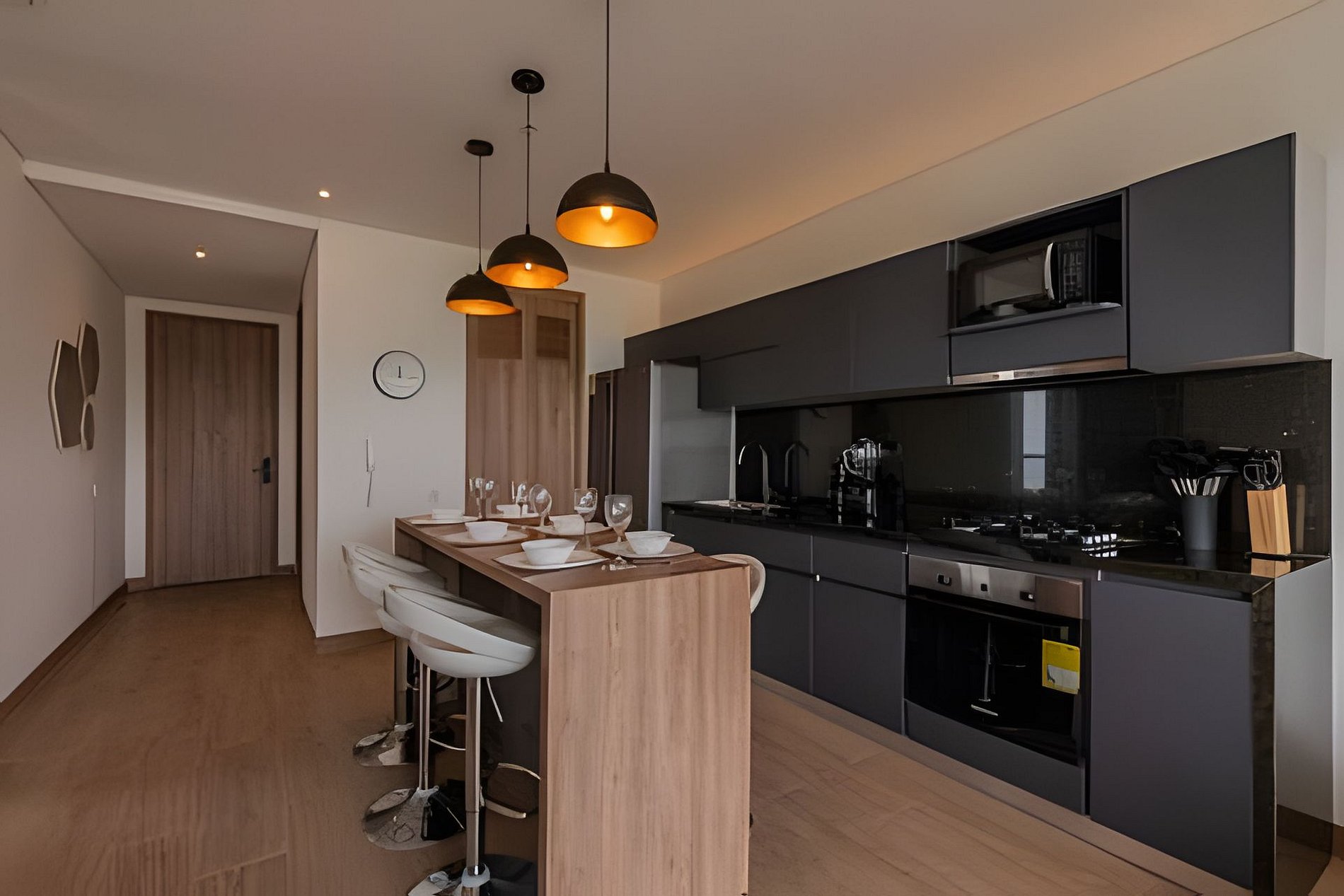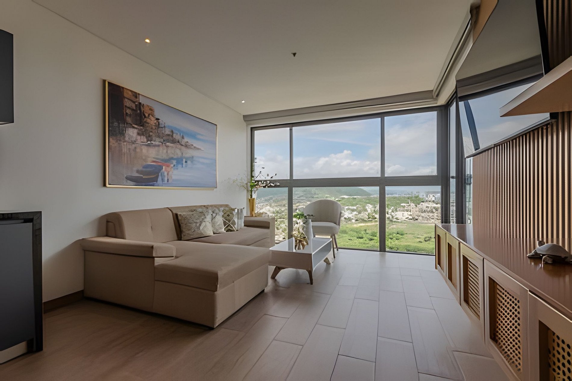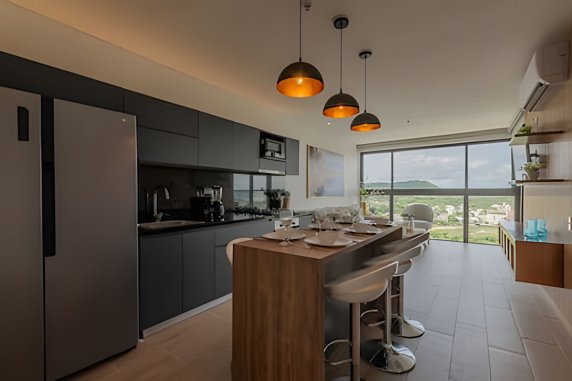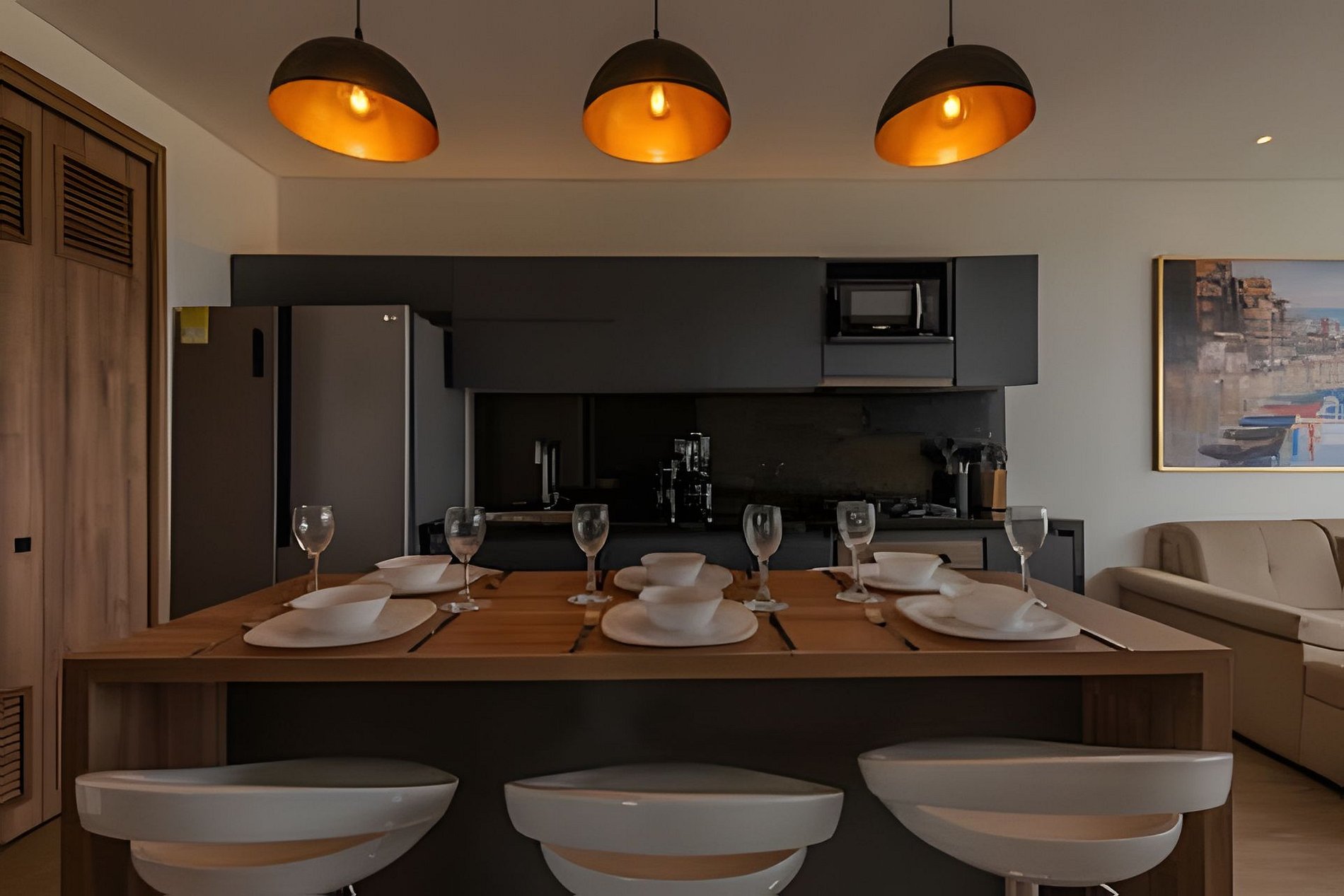 Conexión an internet banda ancha de 300mb y 40 canales de televisión en Directv Go. Tiene cocina completamente dotada, lavadora y secadora, calentador de agua, sala de estar con aire acondicionado y sofá cama doble, Smartv de 55”, baño completo en la zona social, balcón con sillas y mesa exterior que permite guardar bebidas refrigeradas para que disfrutes de un café, un desayuno o una copa de vino.