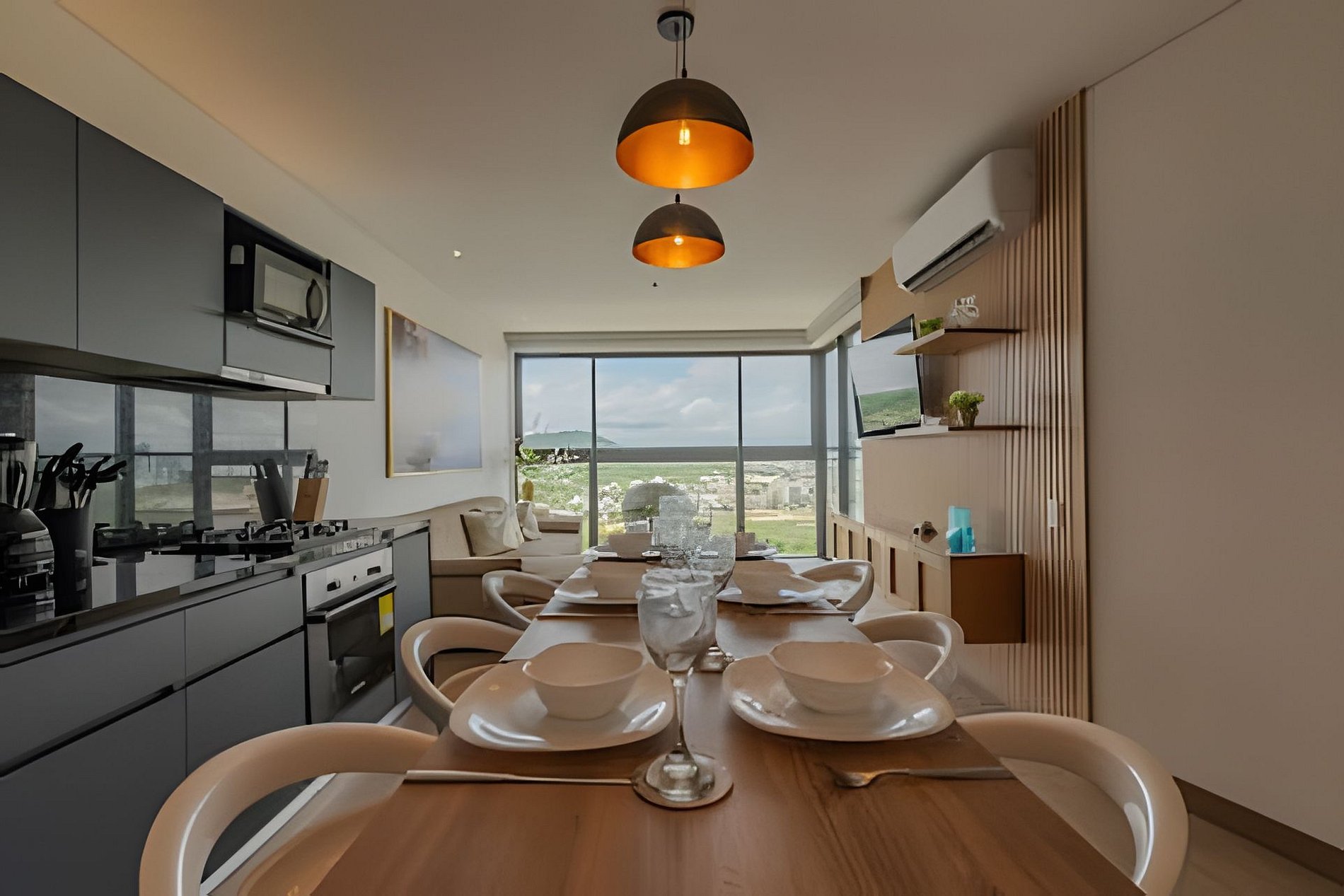 Conexión an internet banda ancha de 300mb y 40 canales de televisión en Directv Go. Tiene cocina completamente dotada, lavadora y secadora, calentador de agua, sala de estar con aire acondicionado y sofá cama doble, Smartv de 55”, baño completo en la zona social, balcón con sillas y mesa exterior que permite guardar bebidas refrigeradas para que disfrutes de un café, un desayuno o una copa de vino.