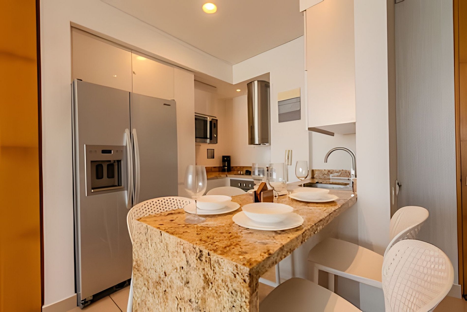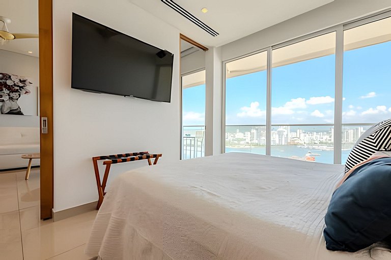 Enjoy this exclusive and elegant apartment in the H2 condominium on the 19th floor, it has an incredible and captivating view of the “Bocagrande” bay and the Historic Center of the city. It has everything you need to spend an unforgettable stay. Enjoy the spectacular beach that is in front of the building! In addition, this building is part of a luxury apartment complex that shares a structure with the Plaza Bocagrande shopping center and the Hyatt Regency Hotel. Take the elevator and you will have access to one of the best shopping centers in our city where you will find everything you need to spend time. an unforgettable stay, you are also 5 minutes by car from the Historic Center of the city! Our apartment has a fully equipped kitchen, washer and dryer (2 in 1), water heater, living room with air conditioning, 300mb internet, balcony with chairs and an outdoor table so you can enjoy a coffee, breakfast or a spectacular sunset. In the living room there is a sofa bed, a 55” television and a desk with a comfortable chair where you can work comfortably. The master bedroom also has ocean views, and access to the balcony, queen bed, 55” television, air conditioning, dressing room and full bathroom. You have pillows, towels, sheets and blankets. Our apartment is ideal for short or long stays. If you need cleaning service during your stay, you must notify us 24 hours in advance. This service has an additional cost.