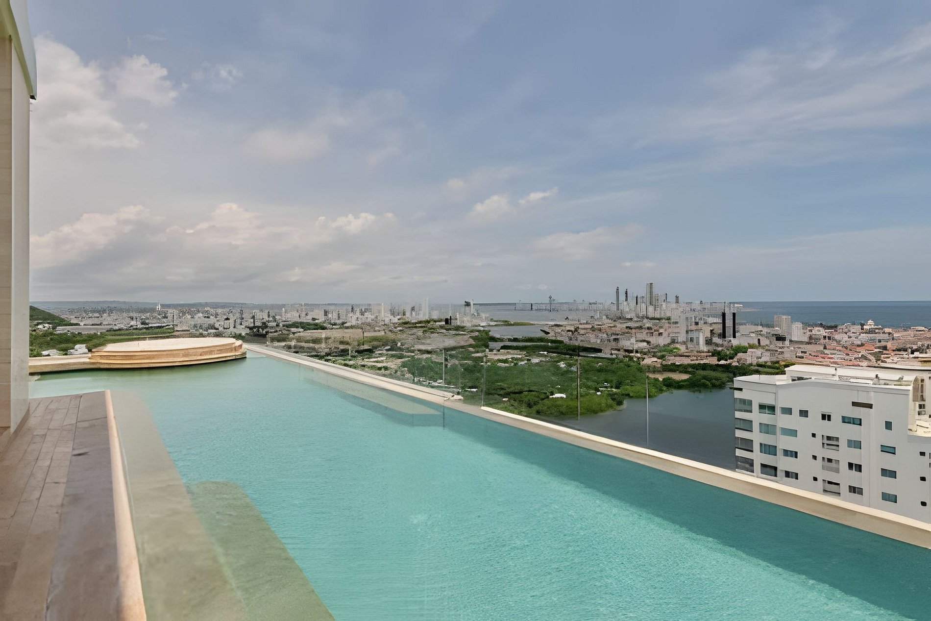 El condominio ofrece amenities de lujo: piscina infinita con vista espectacular, jacuzzi, gimnasio, coworking moderno, turco, sauna y terraza bar. Ubicado estratégicamente a 8 minutos del centro histórico y a una cuadra del mar, con parqueadero privado y portería 24/7.