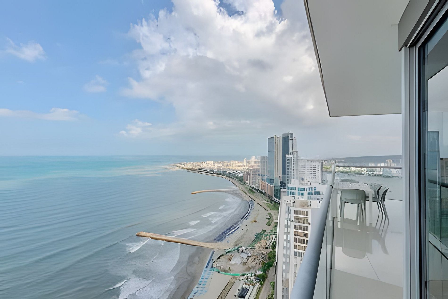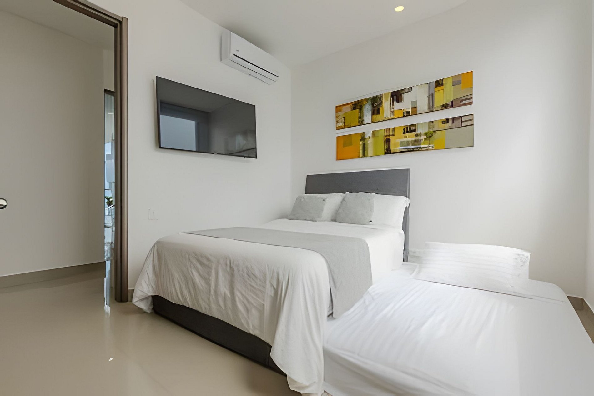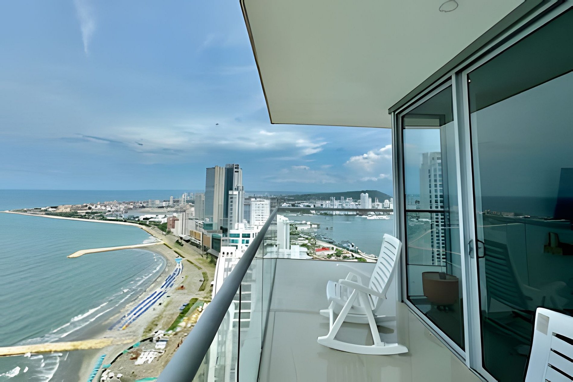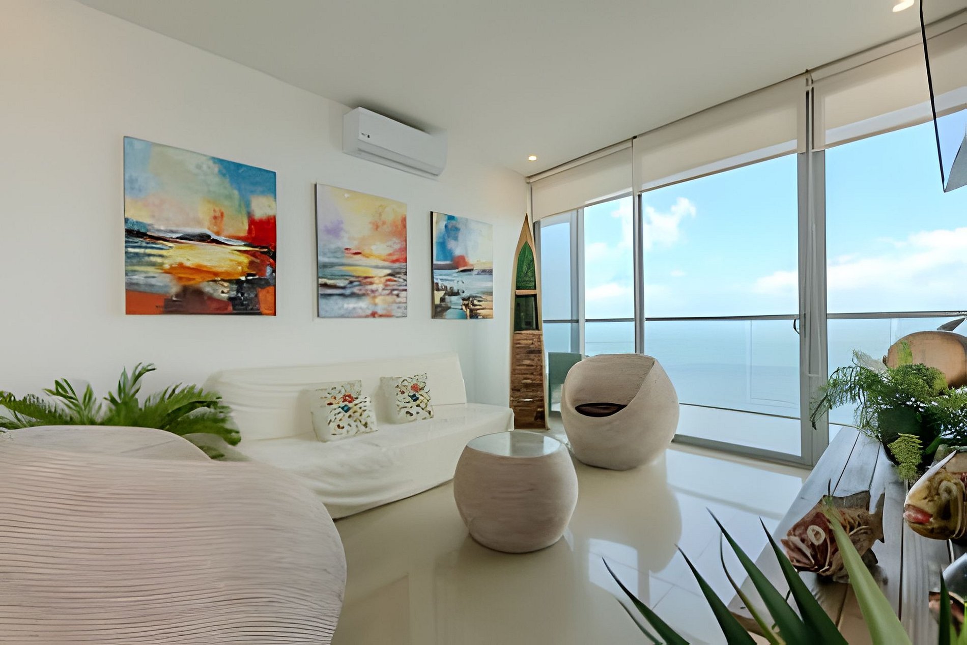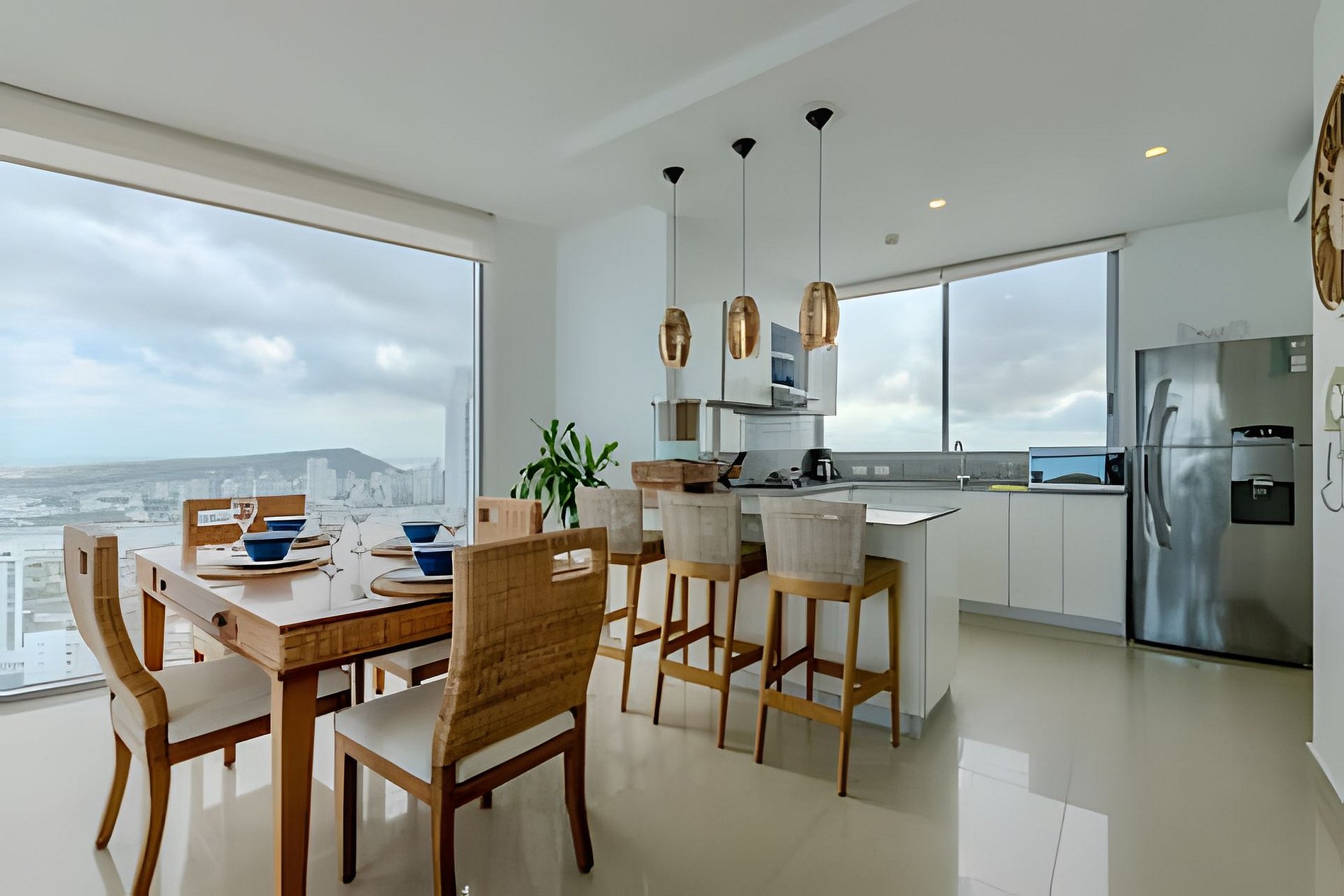 Impressive double-height design, with floor-to-ceiling windows that highlight the beauty and exclusivity of this unit! Enjoy its impressive panoramic view, feel on top of the world by staying in this 40th floor Penthouse with a spacious, open, bright space and a warm and elegant decoration! Our Penthouse has 2 cozy rooms ideal for resting after a day exploring the walled city. Each of the rooms has a full bathroom to provide complete privacy and comfort to all guests. The balcony is one of the most outstanding spaces of this apartment, as it offers an unparalleled view of the sea and a spectacular panoramic view of the walled city, the bay and its surroundings. There is nothing like enjoying a sunset, breakfast, having a cup of coffee or a glass of wine in this outdoor space! You can also enjoy the spectacular beach that is in front of the building! Furnished and equipped with everything you may need, living room with air conditioning, Smart TV, dining room, equipped kitchen, 350mb fiber optic internet that guarantees a fast and stable connection. Master bedroom with air conditioning, SmarTv, double trundle bed (another bed can be removed underneath, see photo), full bathroom and closet. Laundry room with washing machine, dryer and water heater. If you need cleaning service during your stay, you must request it 24 hours in advance. This service has an additional cost. For your convenience, it also includes a garage so you can park your vehicle for free and safely (inform when booking if you are bringing a vehicle). The condominium has 24-hour security, a concierge and a reception with bilingual staff to ensure the peace of mind of all guests. It has a power plant in case of emergency. In short, this apartment has it all: privileged location, large spaces, modern finishes and a wide range of internal and external features that make it ideal for having the best stay. Don't miss the opportunity to stay in this beautiful and exclusive apartment in Cartagena! Make your reservation today and get ready to live an unforgettable vacation in Colombia, we will be happy to help you! Visitors are not allowed in this condominium, changes or additions to the guest list are not allowed, only the people mentioned at the time of reservation can enter.