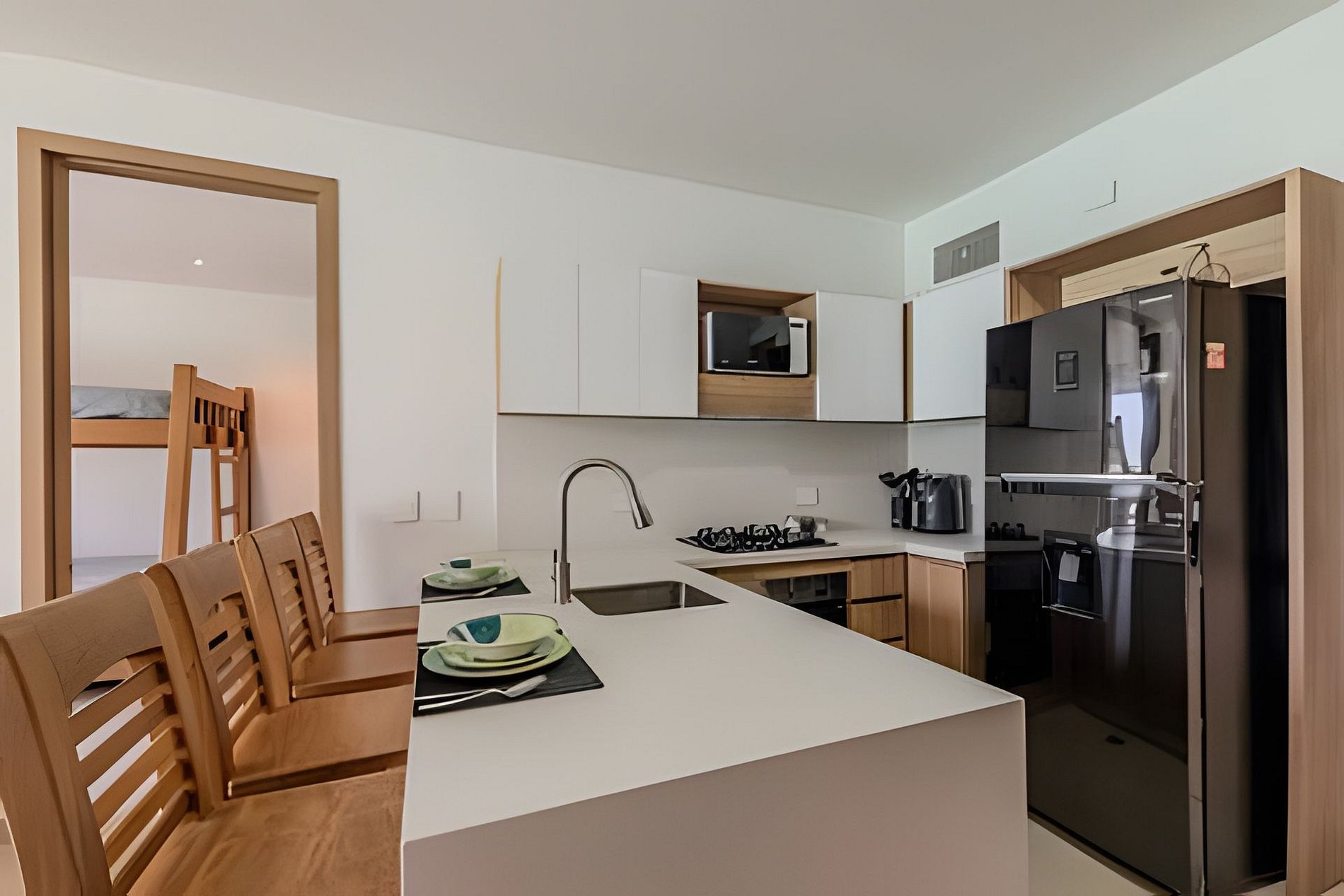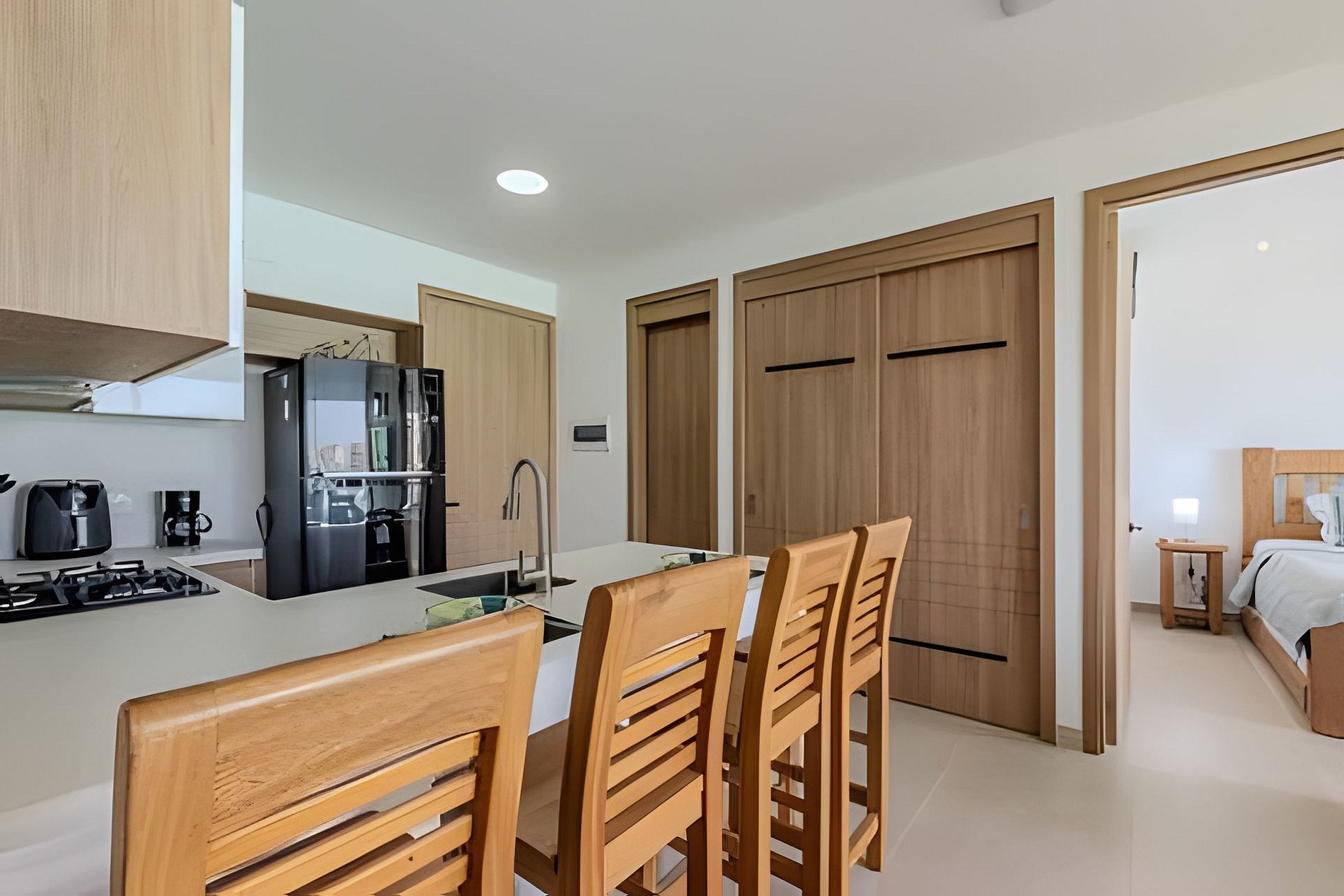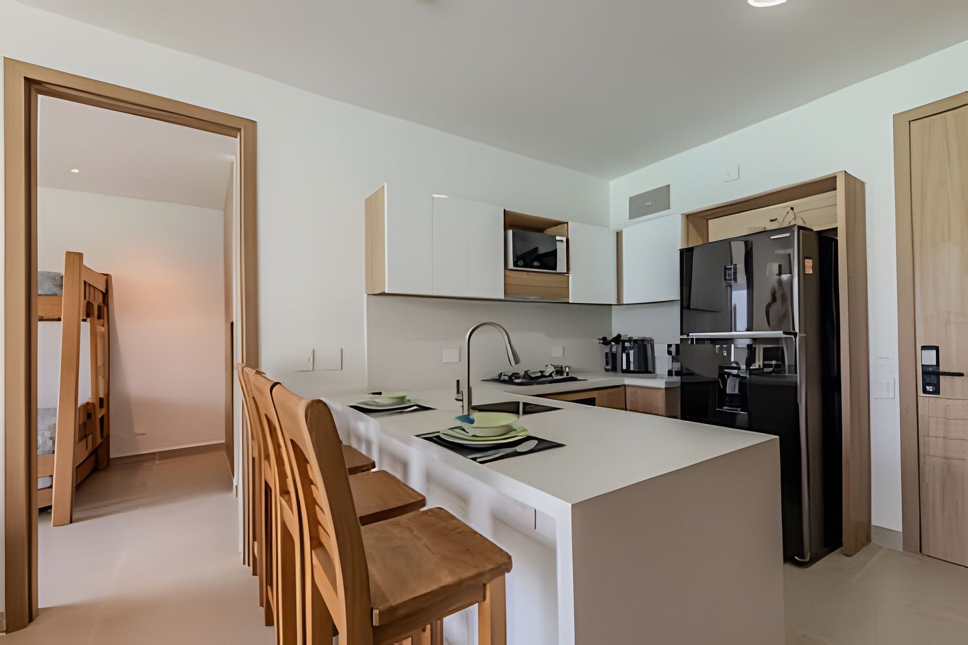 Bienvenido a nuestro exclusivo alojamiento en “Baia Kristal”, diseñado para ofrecerte una experiencia única y lujosa. Nuestro espacio está cuidadosamente decorado con un diseño sofisticado y acabados de alta calidad, creando un ambiente acogedor y elegante. Te ofrecemos todos los servicios y comodidades necesarias para una estancia ¡Inolvidable! Te invitamos a vivir una experiencia de lujo y confort, nuestro apartamento tiene dos habitaciones amplias, la primera con cama king y smart TV, la segunda habitación tiene un camarote con una cama doble una sencilla y otra más sencilla que es nido (se saca una cama por debajo), es decir, se pueden acomodar hasta 4 personas y tiene Smart TV, en la sala un espectacular sofá cama muy cómodo, Smart TV de, cocina integrada completamente dotada. Hay aire acondicionado en las habitaciones y en la sala de estar, zona de labores con lavadora y secadora, y un hermoso balcón con mobiliario exterior para que disfrutes una vista increíble a la laguna cristalina y playa blanca!. Nota: aunque el condominio Baia Kristal aún está en construcción, el apartamento está completamente terminado y amoblado, podrás disfrutar plenamente de la laguna cristalina y sus actividades, como el kayak, ten en cuenta que los trabajos en el condominio se hacen del lunes a sábado de 8am a 6pm, agradecemos tu comprensión.