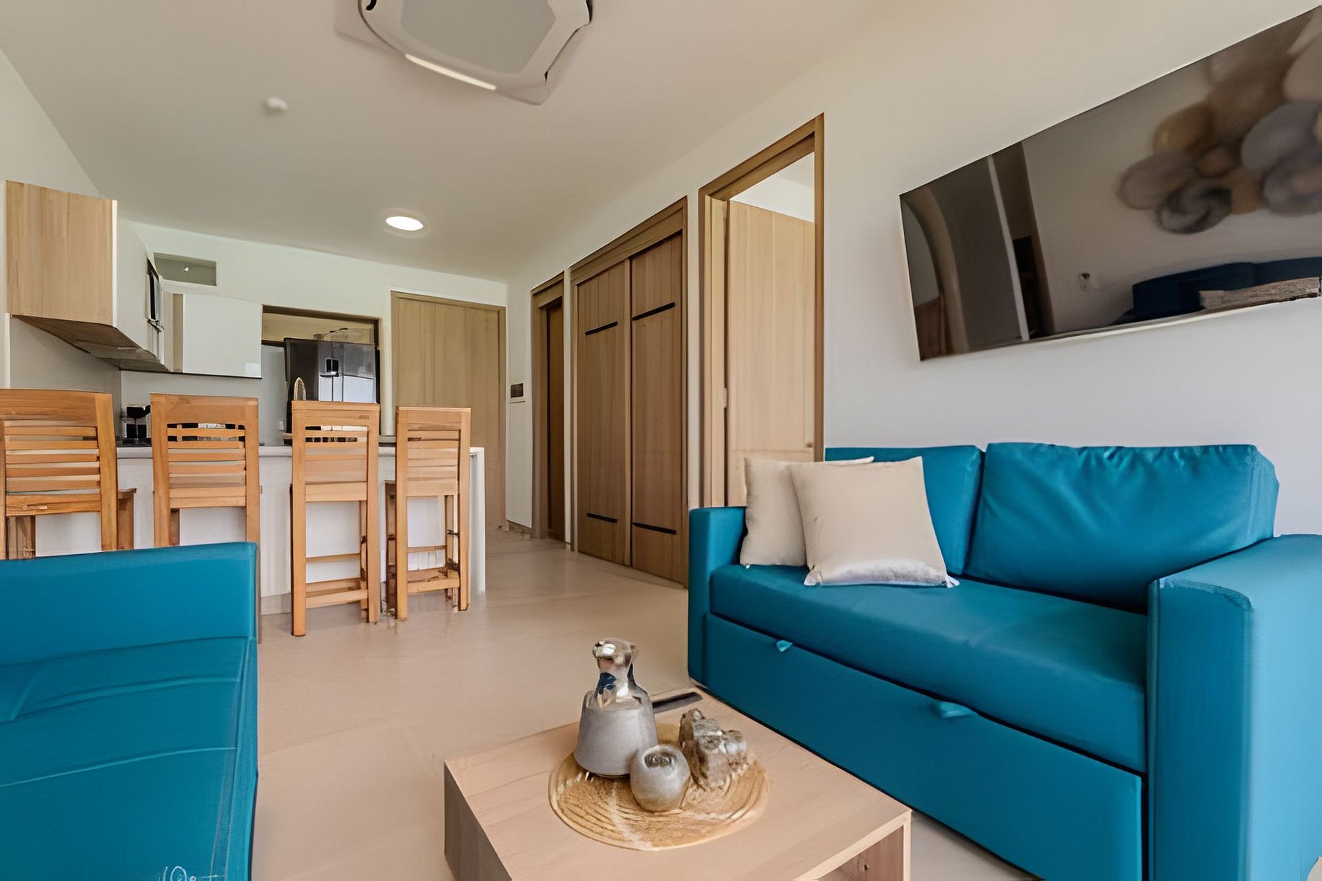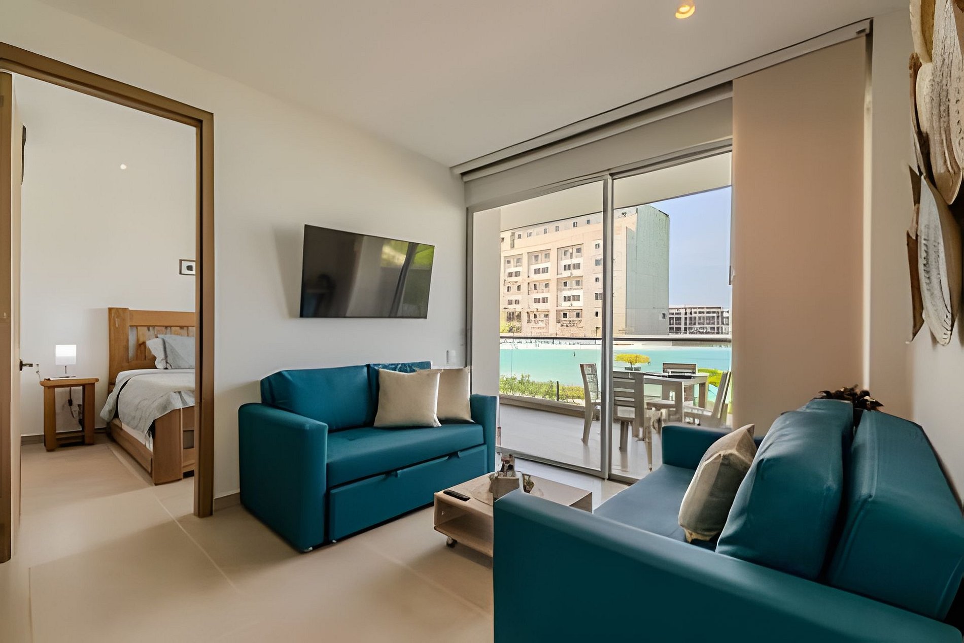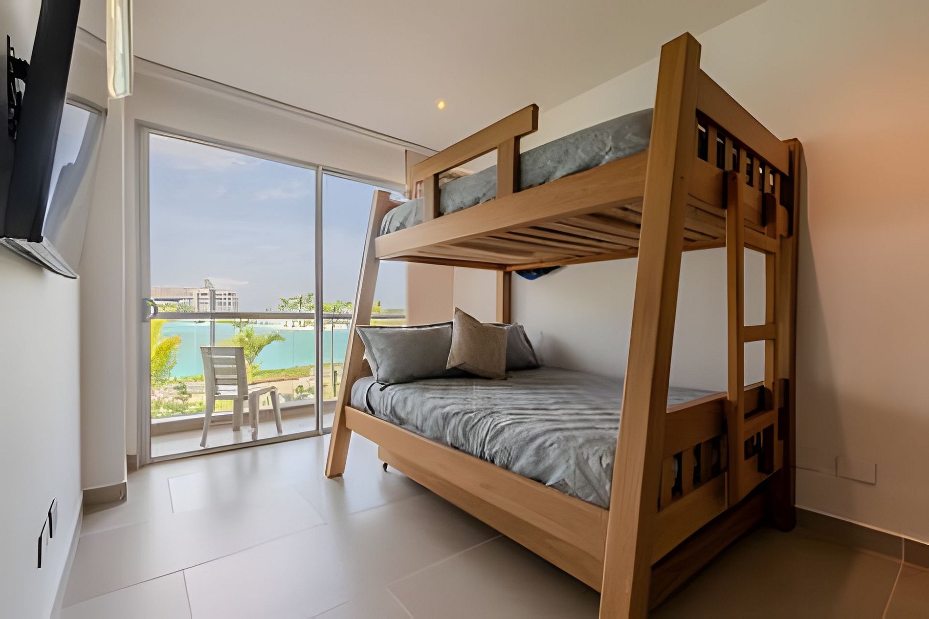Bienvenido a nuestro exclusivo alojamiento en “Baia Kristal”, diseñado para ofrecerte una experiencia única y lujosa. Nuestro espacio está cuidadosamente decorado con un diseño sofisticado y acabados de alta calidad, creando un ambiente acogedor y elegante. Te ofrecemos todos los servicios y comodidades necesarias para una estancia ¡Inolvidable! Te invitamos a vivir una experiencia de lujo y confort, nuestro apartamento tiene dos habitaciones amplias, la primera con cama king y smart TV, la segunda habitación tiene un camarote con una cama doble una sencilla y otra más sencilla que es nido (se saca una cama por debajo), es decir, se pueden acomodar hasta 4 personas y tiene Smart TV, en la sala un espectacular sofá cama muy cómodo, Smart TV de, cocina integrada completamente dotada. Hay aire acondicionado en las habitaciones y en la sala de estar, zona de labores con lavadora y secadora, y un hermoso balcón con mobiliario exterior para que disfrutes una vista increíble a la laguna cristalina y playa blanca!. Nota: aunque el condominio Baia Kristal aún está en construcción, el apartamento está completamente terminado y amoblado, podrás disfrutar plenamente de la laguna cristalina y sus actividades, como el kayak, ten en cuenta que los trabajos en el condominio se hacen del lunes a sábado de 8am a 6pm, agradecemos tu comprensión.