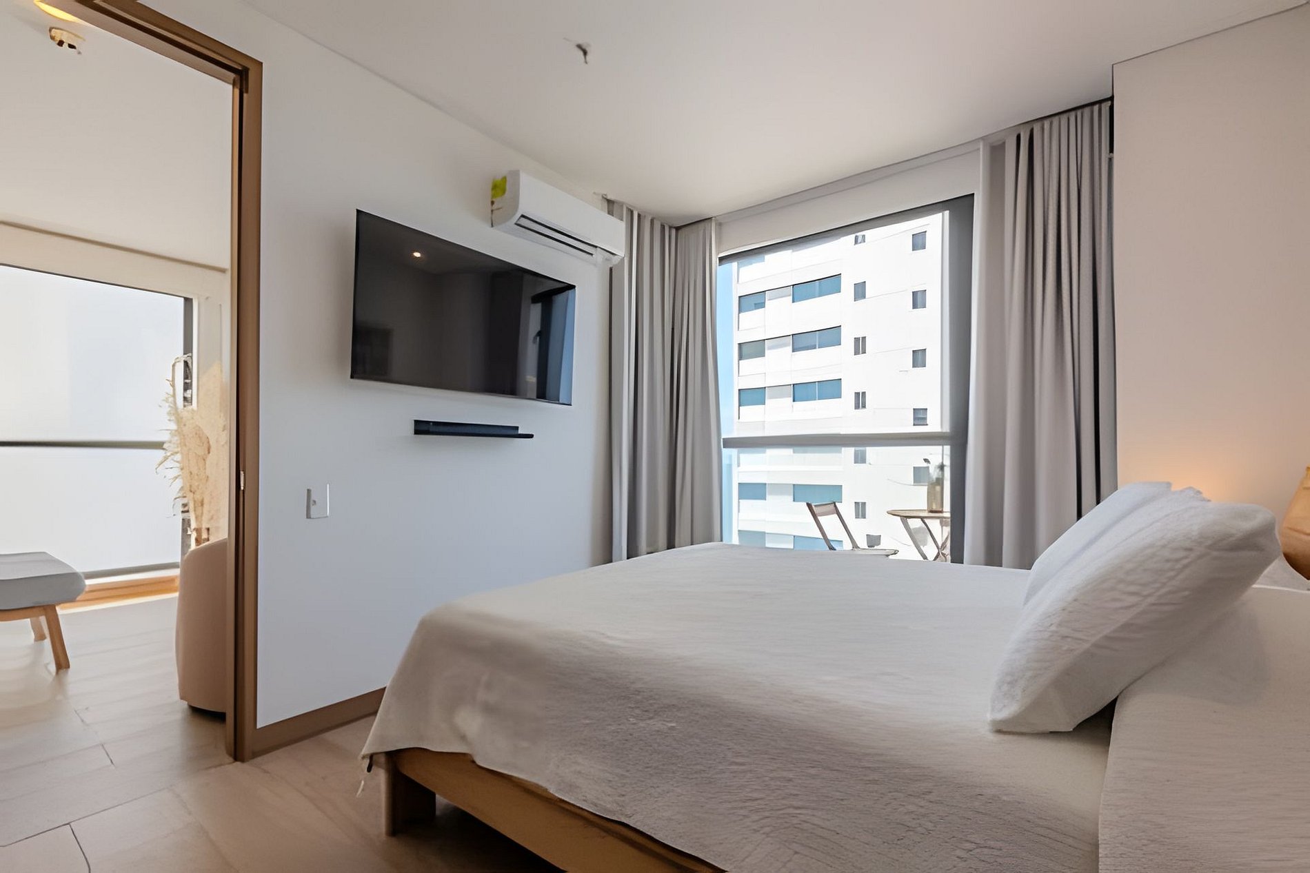 Inmobiliaria Grupo Vita te ofrece este espectacular apartamento para estrenar en el condominio Murano Centro, con una ubicación estratégica, a una cuadra del mar y a 480 metros del centro comercial la Serrezuela y Centro Histórico. Las zonas sociales te dejarán asombrado, con una vista panorámica 360 grados de la ciudad, piscina, jacuzzi coworking, gimnasio, turco y bar. Nuestro apartamento es perfecto para aquellos que buscan comodidad y estilo en una de las ciudades más hermosas de Colombia! Disfruta este exclusivo y elegante apartamento nuevo en el condominio “Murano Centro” en el piso 12 con vista al Mar Caribe! Disfruta de la espectacular playa que está a una cuadra del edificio! Cuenta con todo lo necesario para pasar una estancia inolvidable. Conexión a internet banda ancha. Tiene cocina completamente dotada, lavadora y secadora (2 en 1), calentador de agua, sala de estar con aire acondicionado, baño completo en la zona social, balcón con muebles de exterior , para que disfrutes de una copa de vino o un café con la espectacular vista al Mar Caribe! También hay una sala exterior con mesa de centro para que disfrutes de un café, La habitación principal tiene cama queen, smart TV de 50”, aire acondicionado, closet y baño completo. La segunda habitación tiene un camarote con dos camas sencillas (1.20), smart TV y aire acondicionado. Ofrecemos almohadas, toallas, sábanas y cobijas, shampoo, acondicionador, jabón corporal y jabón para manos. Nuestro apartamento es ideal para estadías cortas o largas. Disfruta de un ambiente sostenible y eficiente, donde podrás reducir tu consumo de energía y contribuir al cuidado del medio ambiente. ¡Vive de manera responsable y cómoda en este alojamiento lleno de innovación y tecnología! Este apartamento cuenta con un moderno sistema de ahorro de energía tipo hotelero. Al momento de su llegada se le enviará la clave para abrir una caja de seguridad donde se encuentra la tarjeta que abre la cerradura y activa el suministro de energía. No se permiten visitantes, ni cambios o adiciones de huéspedes, sólo podrán ingresar las personas registradas al momento de la reserva. •No incluido en la tarifa: $20.000 (5 dólares) por huésped, correspondiente a pulsera que los identifica como huéspedes del edificio.