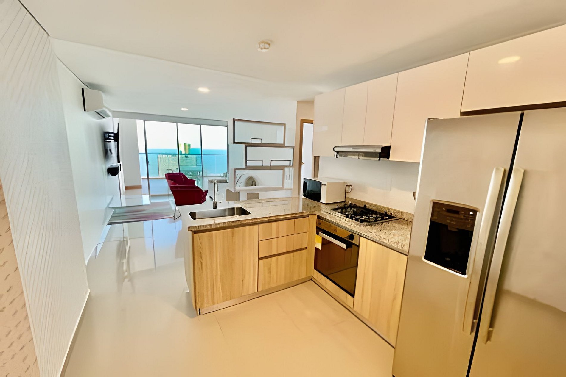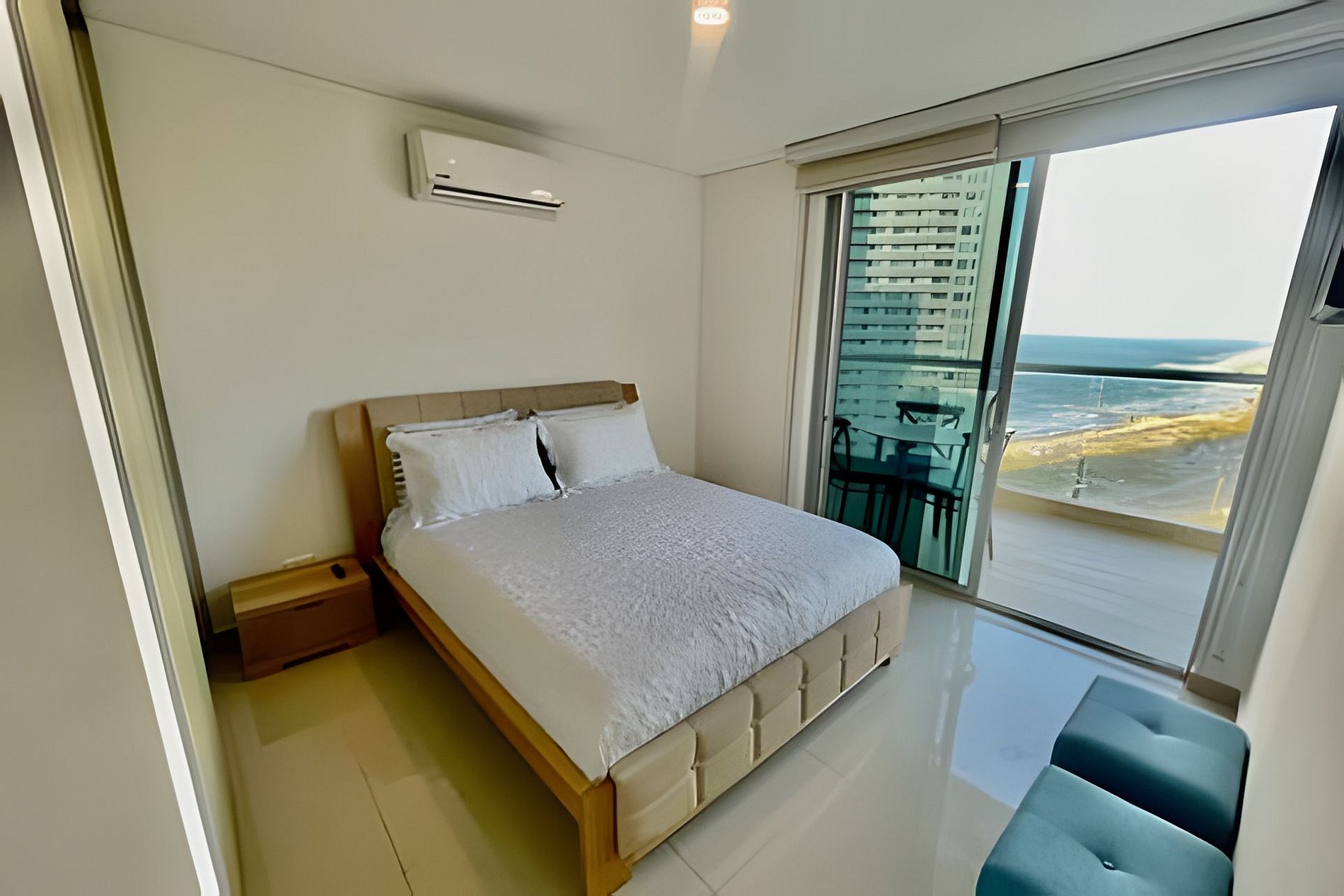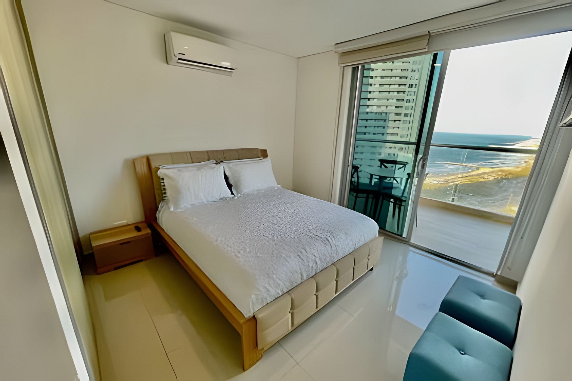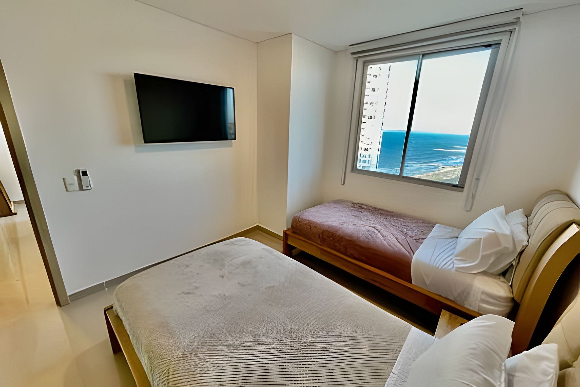 El apartamento tiene 2 alcobas distribuidas en una de ellas con una cama quen ( doble ) y en la otra habitación una dos camas sencillas, en la sala tiene un sofá cama que duermen 2 personas, tiene un balcón con un mueble y un comedor de 4 puestos con una maravillosa vista al Mar Caribe, dos tvs hD, con wifi, cocina grande con todos los utensilios de aseo, lavadora secadora y dos baños completos.