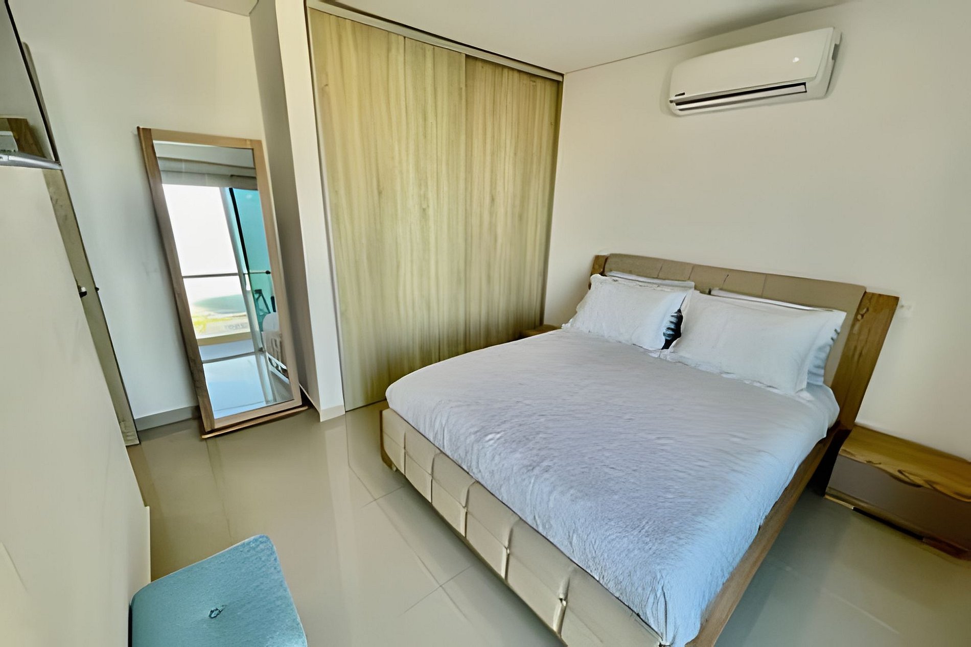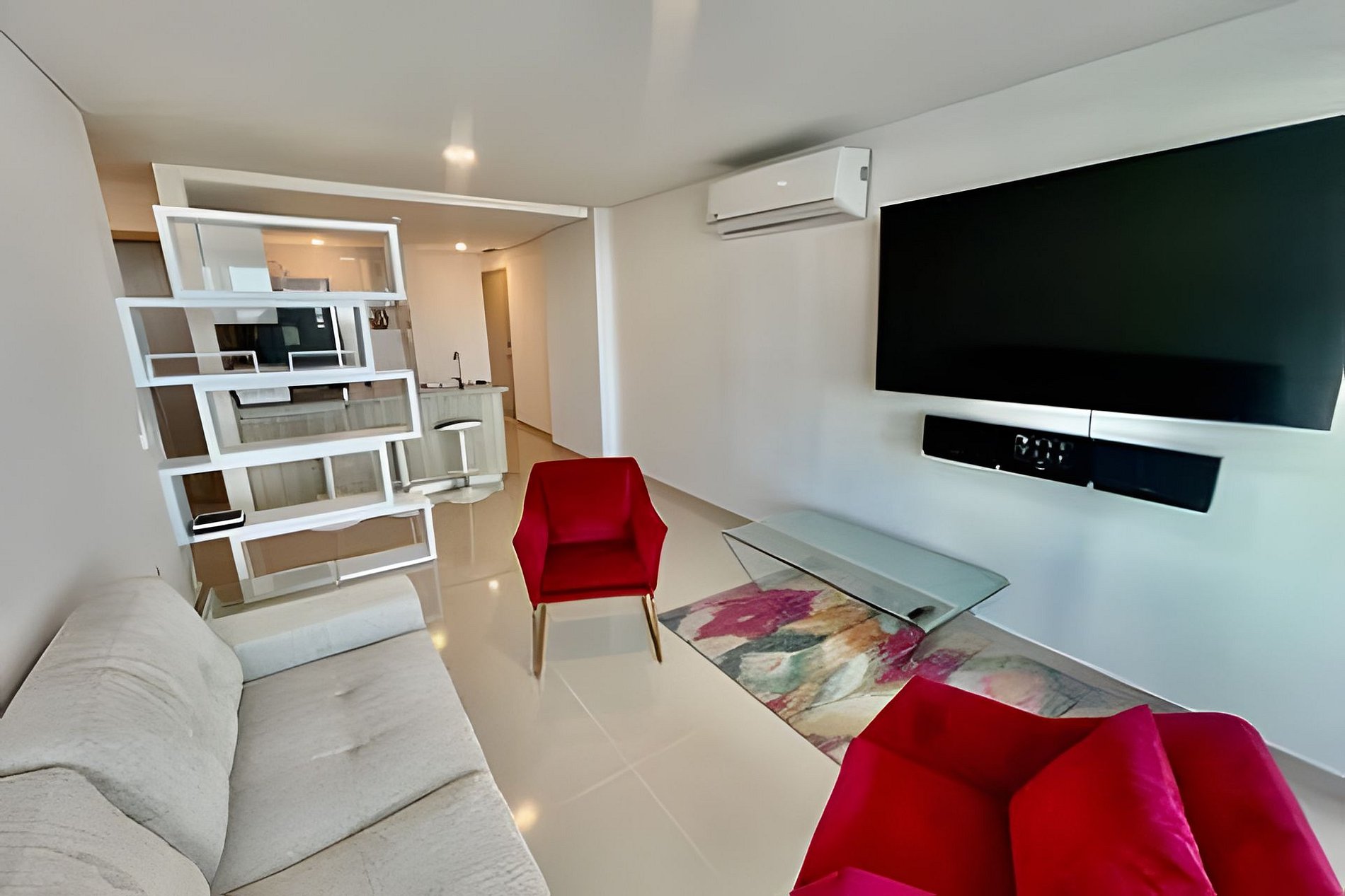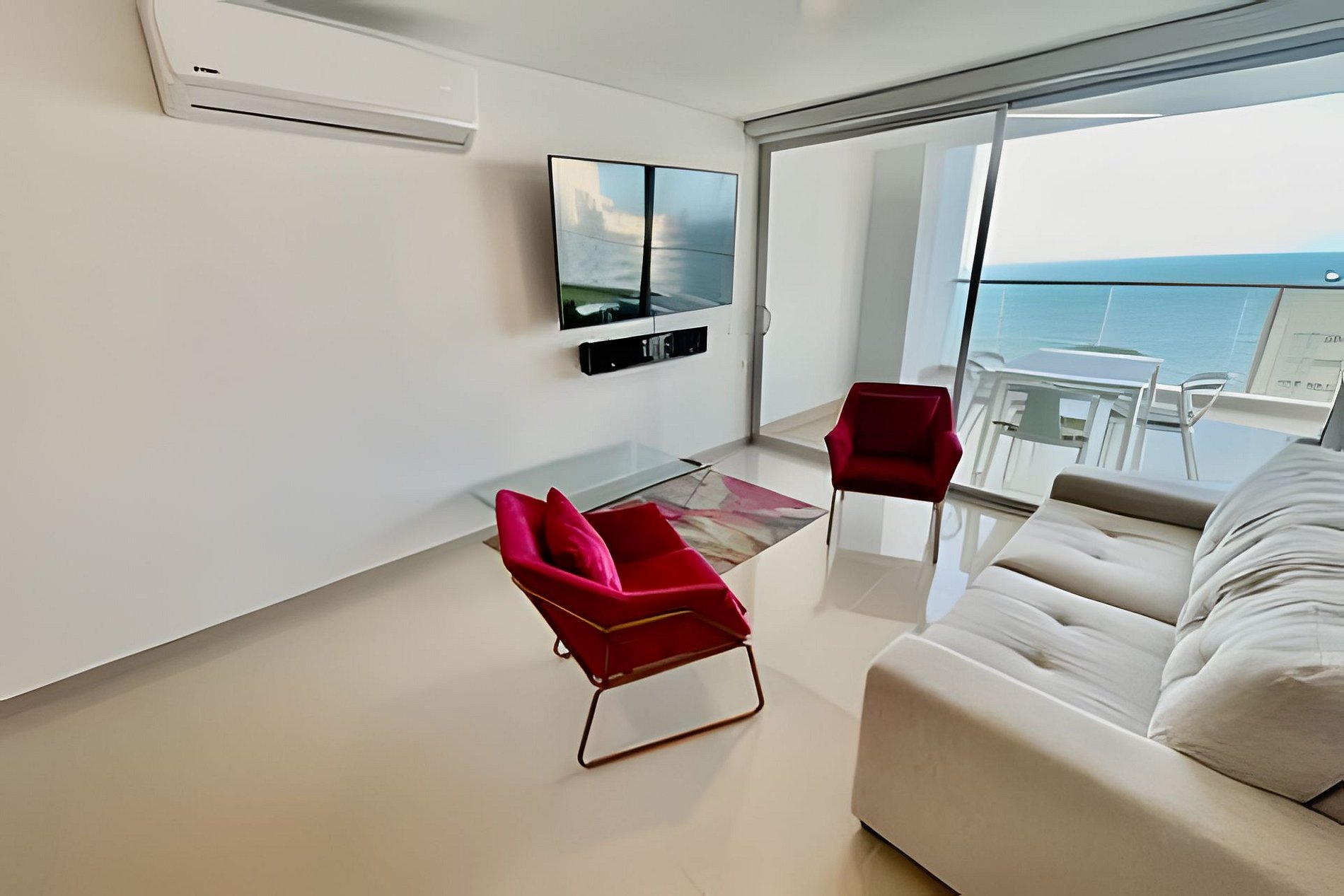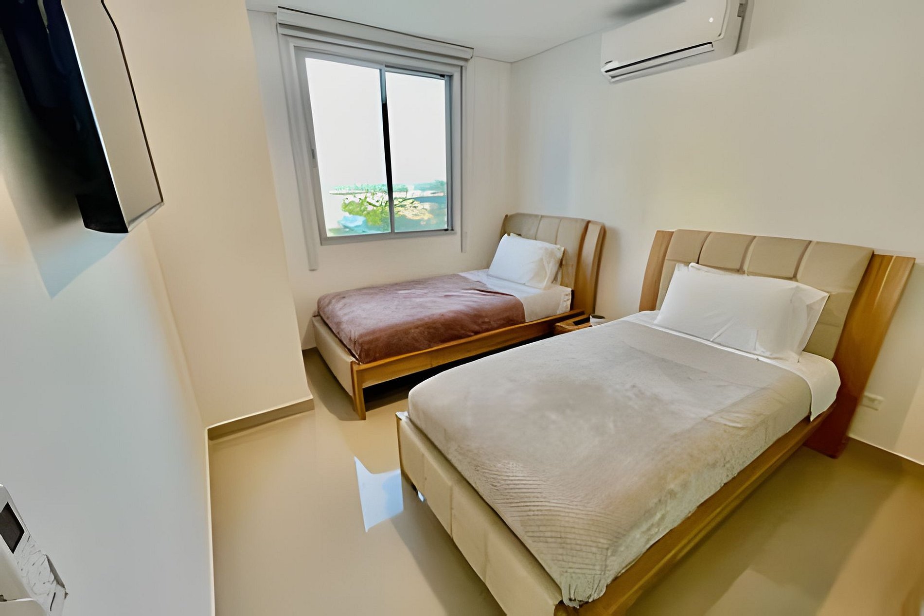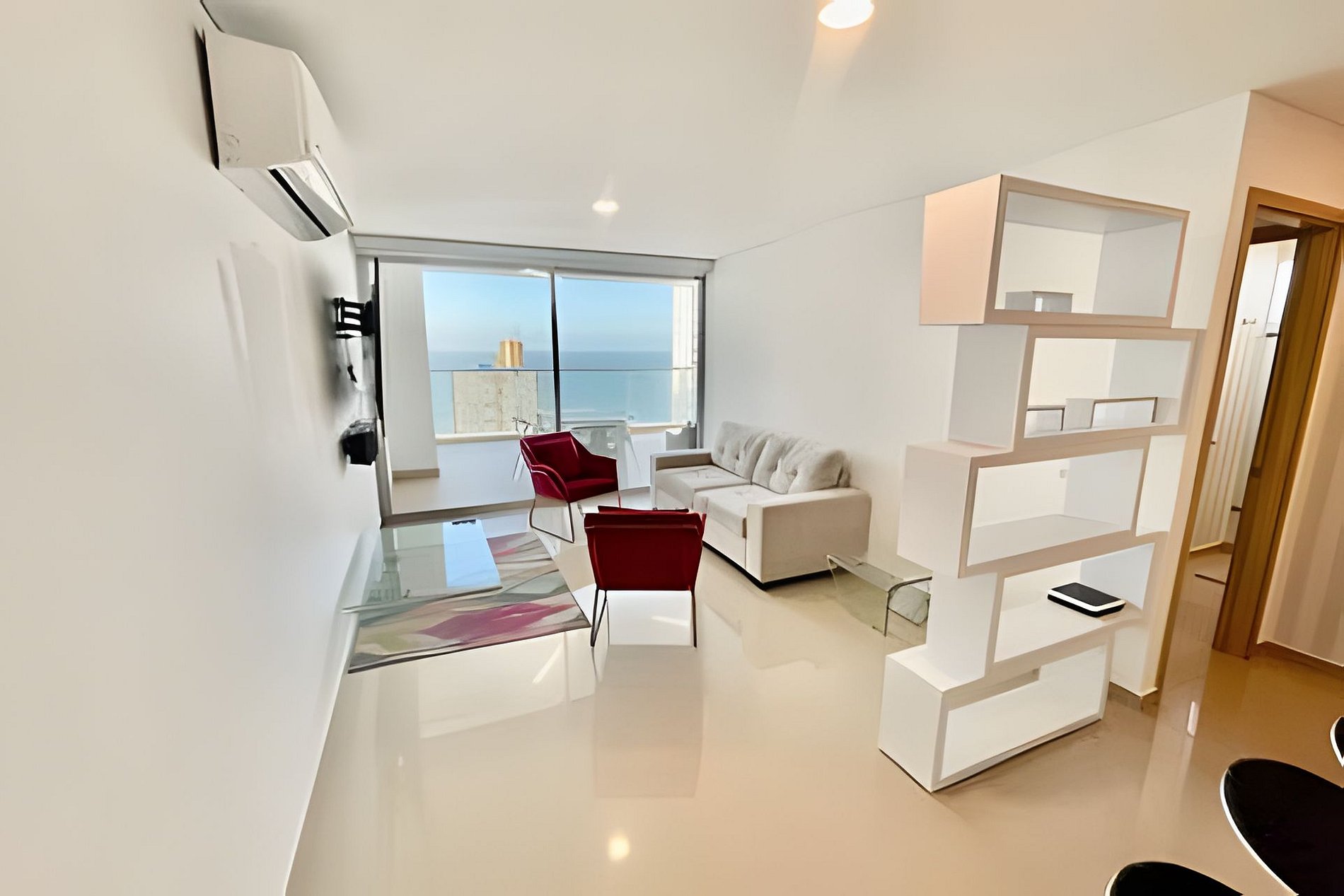 El apartamento tiene 2 alcobas distribuidas en una de ellas con una cama quen ( doble ) y en la otra habitación una dos camas sencillas, en la sala tiene un sofá cama que duermen 2 personas, tiene un balcón con un mueble y un comedor de 4 puestos con una maravillosa vista al Mar Caribe, dos tvs hD, con wifi, cocina grande con todos los utensilios de aseo, lavadora secadora y dos baños completos.