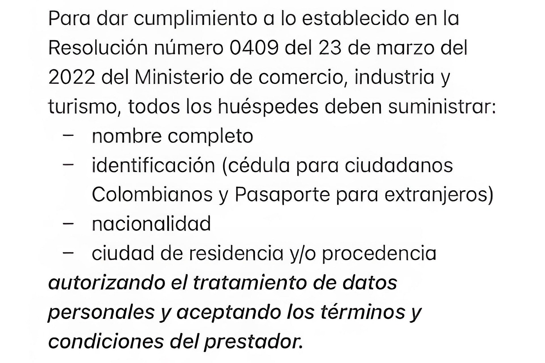 No se permiten visitantes, sólo podrán ingresar las personas registradas como huéspedes al momento de la reserva. Para dar cumplimiento a lo establecido en la Resolución número 0409 del 23 de marzo del 2022 delMinisterio de comercio, industria y turismo, todos los huéspedes deben suministrar: - nombre completo - identificación (cédula para ciudadanos Colombianos y Pasaporte para extranjeros) - nacionalidad - ciudad de residencia y/o procedencia autorizando el tratamiento de datos personales y aceptando los términos y condiciones del prestador. • Piscina: abierta de martes a domingo de 10:00 am a 7:00 p.m., lunes a partir de la 1:00 pm por mantenimiento (si es festivo se realiza el martes). • Gimnasio: 6:00 am a 7:00 pm. • Coworking: 8:00 am a 6:00pm • Jacuzzi y Turco: relájate y disfruta en los mismos horarios de la piscina • Terraza/bar: de 10:00 am a 3:00 pm. para disfrutar de la vista y los buenos momentos.