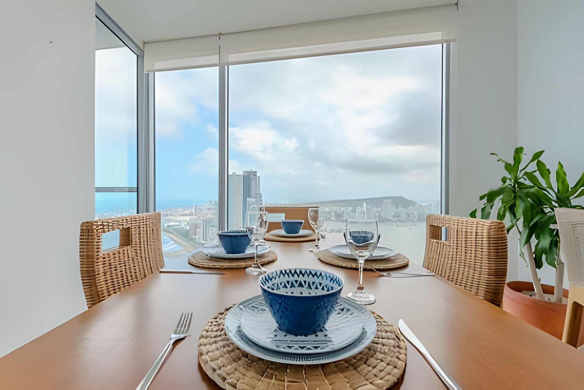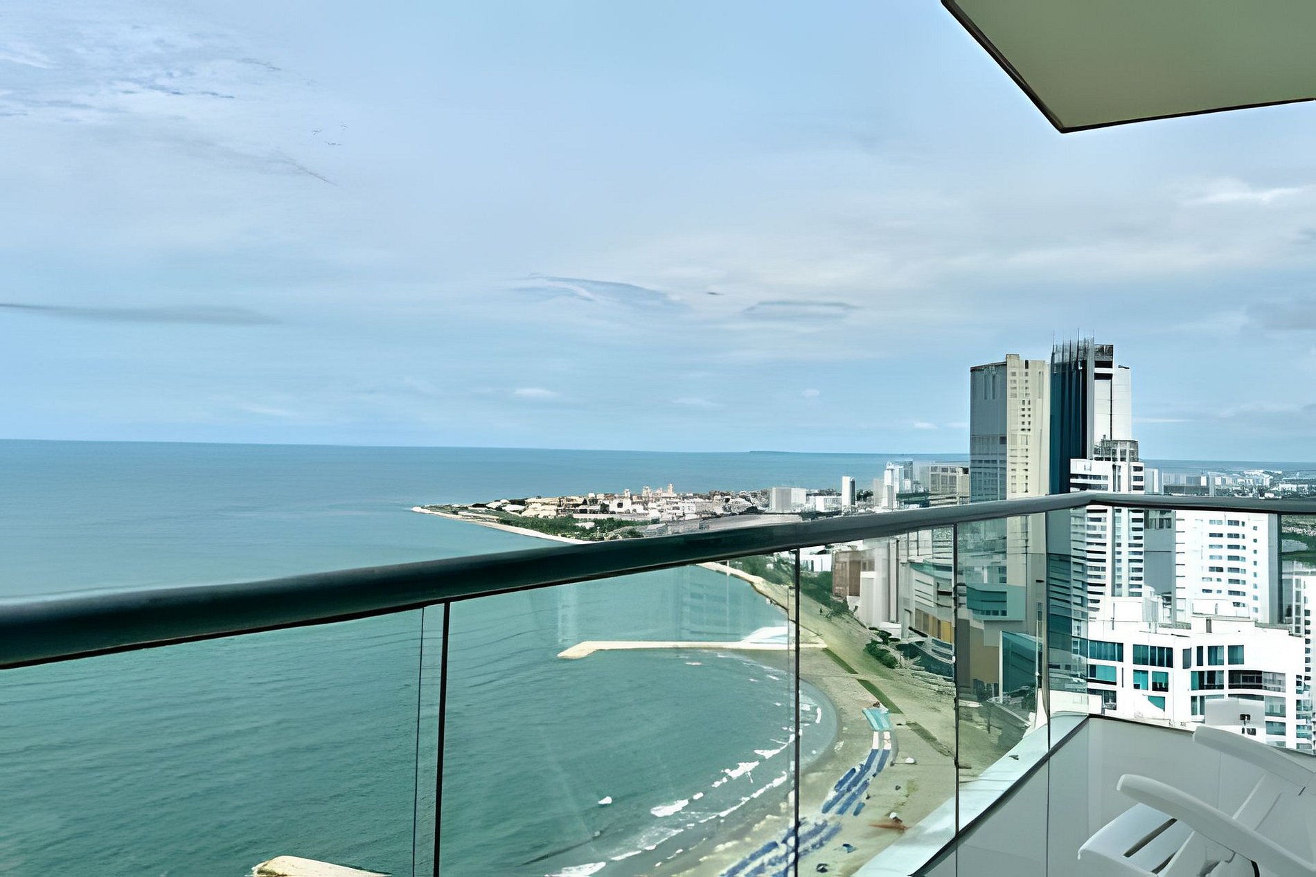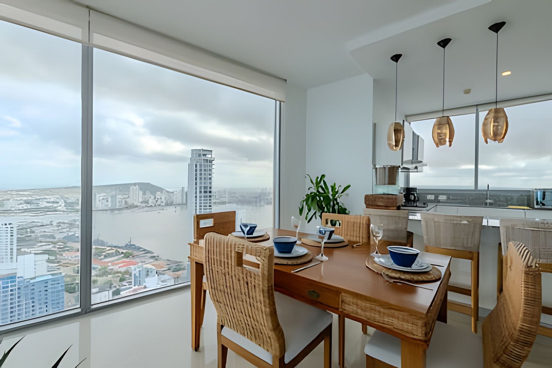 Diseño impresionante de doble altura, con ventanales de piso a techo que resaltan la belleza y exclusividad de esta unidad! Disfruta de su impresionante vista panorámica, siéntete en la cima del mundo alojándote en este Penthouse del piso 40 con un espacio amplio, abierto, luminoso y una decoración cálida y elegante! Nuestro Penthouse tiene 2 acogedoras habitaciones ideales para descansar después de un día explorando la ciudad amurallada. Cada una de las habitaciones cuenta con un baño completo para proporcionar total privacidad y comodidad a todos los huéspedes. El balcón es uno de los espacios más destacados de este apartamento, ya que ofrece una vista inigualable al mar y una espectacular vista panorámica de la ciudad amurallada, la bahía y sus alrededores. iNo hay nada como disfrutar de una puesta de sol, un desayuno, tomar una taza de café o una copa de vino en este espacio al aire libre! ¡También puedes distrutar de la espectacular playa que esta frente al edificio! Amoblado y equipado con todo lo que puedas necesitar, sala de estar con aire acondicionado, Smartv, comedor, cocina dotada, internet fibra óptica de 350mb que garantiza una conexión rápida y estable. Dormitorio principal con aire acondicionado, Smartv, cama 1.80m, baño completo, armario y acceso al balcón. Habitación 2: aire acondicionado, SmarTv, cama nido doble (se le saca otra cama por debajo, ver foto) baño completo y armario. Cuarto de lavado con lavadora, secadora y calentador de agua. Si necesitas servicio de limpieza durante tu estancia, debes solicitarlo con 24 horas de anticipación. Este servicio tiene un costo adicional. Para tu comodidad, también incluye un garaje para que puedas estacionar tu vehículo de forma gratuita y segura (informa al momento de reservar si vas a traer un vehículo). El condominio cuenta con seguridad las 24 horas, conserje y recepción con personal bilingüe para garantizar la tranquilidad de todos los huéspedes. Tiene una central eléctrica en caso de emergencia. En resumen, este apartamento lo tiene todo: ubicación privilegiada, grandes espacios, acabados modernos y una amplia gama de características internas y externas que lo hacen ideal para tener la mejor estancia. ¡No te pierdas la oportunidad de alojarte en este hermoso y exclusivo apartamento en Cartagena! Haz tu reservación hoy y prepárate para vivir unas vacaciones inolvidables en Colombia, ¡estaremos encantados de ayudarte! No se permiten visitantes en este condominio, no se permiten cambios, ni adiciones en la lista de huéspedes, sólo pueden ingresar las personas mencionadas al momento de la reserva.