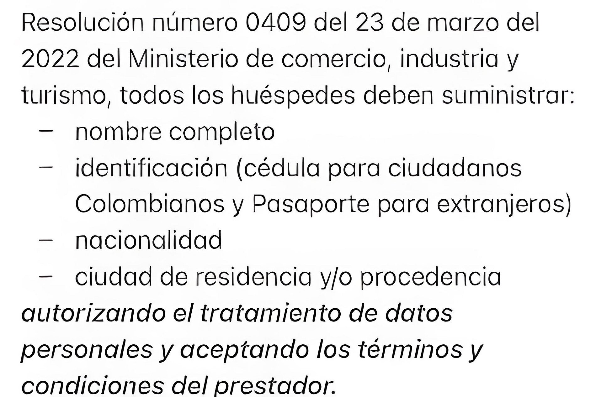 NO SE PERMITEN VISITAS Para dar cumplimiento a lo establecido en la Resolución número 0409 del 23 de marzo del 2022 del Ministerio de comercio, industria y turismo colombiano, todos los huéspedes deben suministrar: - nombre completo - identificación (cédula para ciudadanos Colombianos y Pasaporte para extranjeros) - nacionalidad - ciudad de residencia y/o procedencia (autorizando el tratamiento de datos personales y aceptando los términos y condiciones del prestador) Gracias